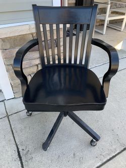 Solid Heavy Wood Desk Chair. Swivel, Tilt, Wheels, Black Stained Finish, Has Curved Seat For Comfort$140Wilmington, NC