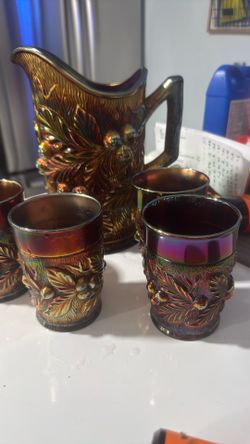 ANTIQUE NORTHWOOD ACORN BURRS CARNIVAL GLASS PITCHER AMETHYST PLUS CUPS$200Pompano Beach, FL