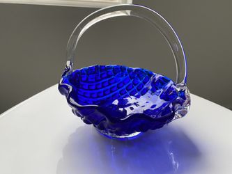 PD Ware COBALT BLUE GLASS HAND BLOWN BASKET WITH CLEAR HANDLE RUFFLED EDGE. $39Downers Grove, IL
