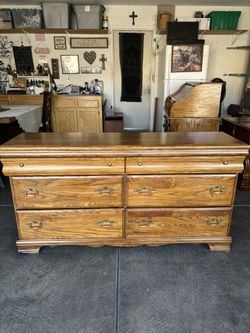 Vintage Long Solid Wood Dresser With Beveled Mirror With 7 Drawers With Brass Handles With Beveled Mirror & 2 Nightstands,Excellent Conditions Like N$300North Las Vegas, NV