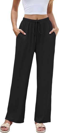 Women High Waist Casual Pants Elastic Wide Leg Summer Beach Palazzo Trousers with Pockets Lightweight Comfy