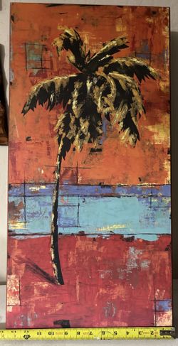 palm tree against a vibrant, abstract background reminiscent of a beach scene On Wooden Box Frame 2 1/4” Thick$50Rio Rancho, NM