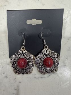 Silver Tone Floral Red Stone Dangle Earring Brand New$15Garden City P, NY