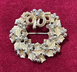Christmas Pin/Brooch. Gold-tone Wreath w/Holly, Berries & Bow. Vintage$12Leander, TX