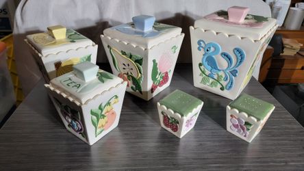 Mid Century Hand Painted Ceramic Canisters in Good Condition, Some Minor Chips, Flour, Sugar, Coffee, Tea, Salt & Pepper Shakers.$175Bakersfield, CA