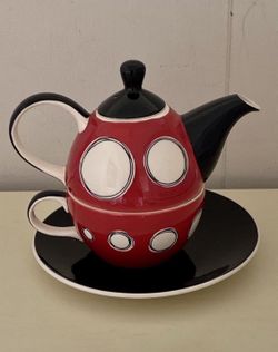 Hues N Brews Stacking Set~Teapot~Cup~Plate~ Red~White~Black Circular Design$20San Diego, CA