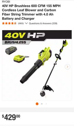40V HP Brushless 600 CFM 155 MPH Cordless Leaf Blower and Carbon Fiber String Trimmer with 4.0 Ah Battery and Charger$300Houston, TX