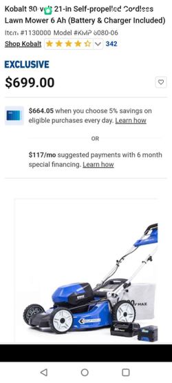 Kobalt 80-volt 21-in Self-propelled Cordless Lawn Mower 6 Ah (Battery & Charger Included$400Garfield Heights, OH
