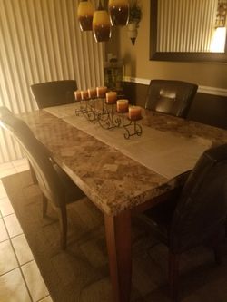 marble dining room table with 6 brown leather chairs$500North Providence, RI