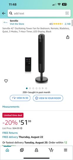 Senville 42" Oscillating Tower Fan for Bedroom, Remote, Bladeless, Quiet, 3 Modes, 7-Hour Timer, LED Display, Black$40Boston, MA