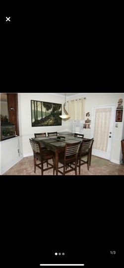 Price Drop Bassett Modern 6 Chair Tall Dining Set with Granite and Wood Top, Coffee Color Stainless Steel Back Chairs, Solid Wood.$800Lynnwood, WA