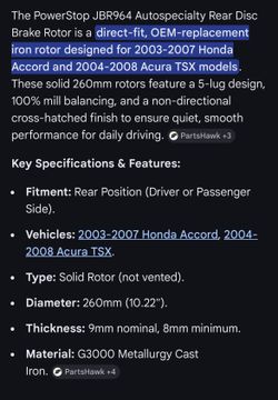 Disc brakes and shoes Vehicles: 2003-2007 Honda Accord, 2004- 2008 Acura TSX.$50Woburn, MA