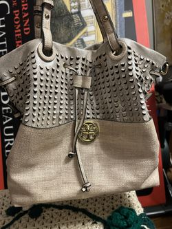 Fashion tote handbag. It's a light beige color with a gold logo and a drawstring closure.$40Columbus, GA