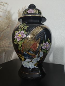 Japanese Porcelain Ginger Jar Black & Gold Pheasant Peonies Hand Painted 12”x7”$50Miami Beach, FL