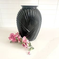 Large 1980s Black Glass Shell Swirl Vase, Vintage Art Deco Vase