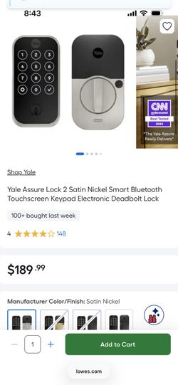 Yale Assure Lock 2 Satin Nickel Smart Bluetooth Touchscreen Keypad Electronic Deadbolt Lock$140Springfield, MO