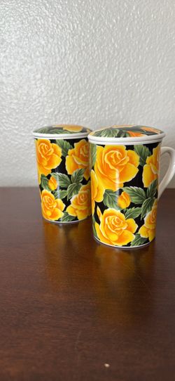 Set of 2 Floral Rose Mug w/ Lid Sambo China Art Korea Coffee Tea Cups Yellow Roses$10Fontana, CA