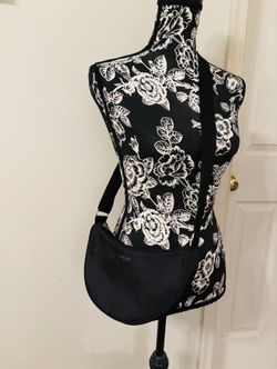 Lancome Black Crescent Nylon Shoulder Bag/ cross body/ Cosmetic Travel or makeup bag Adjustable Strap. Silky look. 12” wide, 5.5” tall 3” Width. Cones$15Sully Station, VA