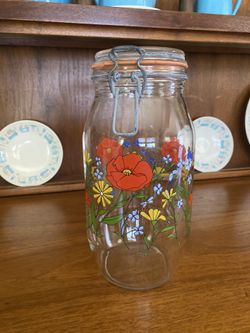 Vintage Arc France hinged lid glass canister with a wildflower/poppy design by R Carman$25Altadena, CA