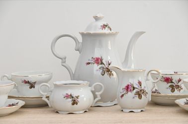This delicate vintage porcelain tea set features an elegant floral motif with pink roses and lush green leaves, beautifully accented with gold trim. T$50Brooklyn, NY