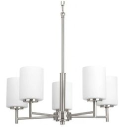5-Light Fixture — brushed nickel finish, etched glass shades, modern linear design. 19.6"H x 21"W, uses 5 medium-base bulbs.$140Brooklyn, NY