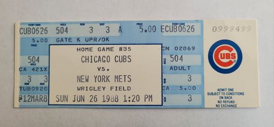 Chicago Cubs vs. New York Mets - Sunday June 26, 1988 Game Ticket that was not used.$10Northbrook, IL