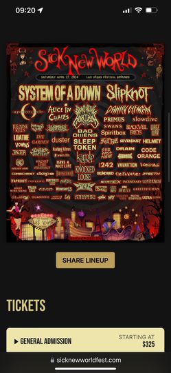 2 GA+ Tickets To Sick New World Festival. $1,000Woodville, CA