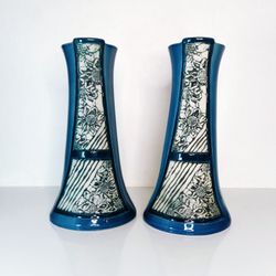 Malaysia Handicraft Tenmoku Pottery Vases Blue White Floral Design 11" Tall Set$90Goodyear, AZ