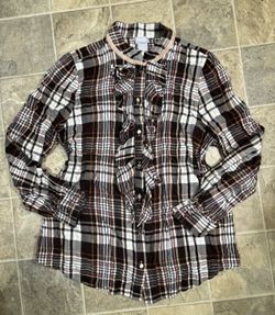 CHICO'S 1 Women's Cotton Plaid Frill Ruffle Shirt Button Up Boho Academia M 8-10$20Seattle, WA