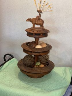 Hand Carved MCM 3-Tier Wooden Monkey Pod Lazy Susan 24” Tall- Man Riding Ox READ$40Cool, TX