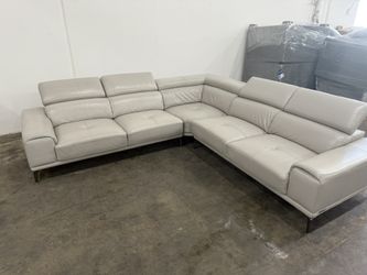 Costco Quinton Top Grain Leather Sectional with Adjustable Headrests, Blue, Mirrored Gunmetal Gray Legs$1,100Irwindale, CA