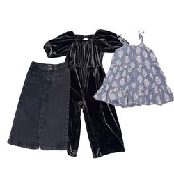 Old Navy Black Velvet jumpsuit size 2T , dress size 18-24m and Jessica Simpson baggy jeans size 24m Elegant black velvet dress with gathered sleeves. $25Sacramento, CA
