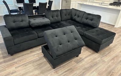 (NEW IN BOX) Black Velvet Sectional With Cup Holder And Free Ottoman -FINANCE AVAILABLE$699Houston, TX