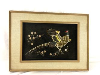 VTG Pheasant Bird Black Velvet Felt Beaded Rhinestones Art Wooden Frame MCM $75Peoria, AZ