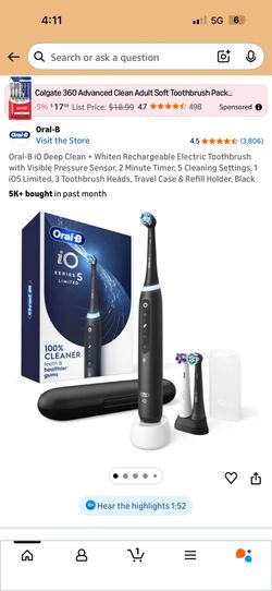 Oral-B io Deep Clean + Whiten Rechargeable Electric Toothbrush with Visible Pressure Sensor, 2 Minute Timer, 5 Cleaning Settings, 1 i05 Limited, 3 Too$100Bakersfield, CA