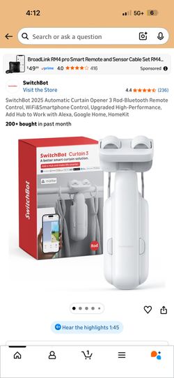 SwitchBot 2025 Automatic Curtain Opener 3 Rod-Bluetooth Remote Control, WiFi&Smartphone Control, Upgraded High-Performance, Add Hub to Work with Alexa$50Bakersfield, CA