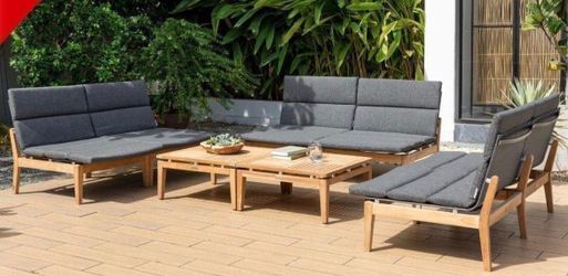 BRAND NEW 8 Piece 100% FSC Solid Teak Patio Seating Set With Grey Cushions | Ideal Furniture Set For Outdoor