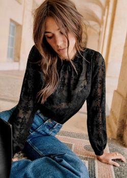 BNWT SEZANE Valentine Black Embroidered Blouse US 8 FR 40 Long-Sleeve Sheer Mock Neck Runs Small$115Chicago, IL