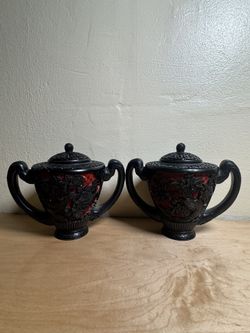 Pair of Vintage Chinese Cinnabar Lacquer Lidded Vases – Black Floral Carving with Blue Enamel Interior – Brass Trim – Mid Century Oriental Decor$300Queens, NY