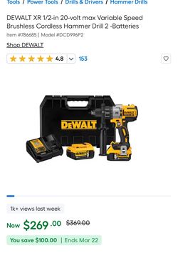 DEWALT XR 1/2-in 20-volt max Variable Speed Brushless Cordless Hammer Drill 2 -Batteries$220Victorville, CA