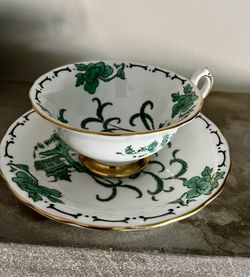 PEKIN~ROYAL CHELSEA~ENGLISH BONE CHINA~Green, White, Gold~CUP & SAUCER~ENGLAND$21Highland Park, IL