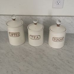 Tea Coffee And Sugar Canisters Glass Beige And Taupe W Crystal Handle $75Princeton, FL