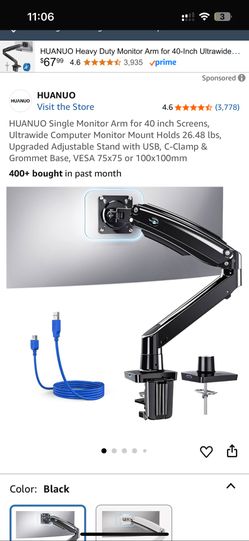 HUANUO Single Monitor Arm for 40 inch Screens, Ultrawide Computer Monitor Mount Holds 26.48 lbs, Upgraded Adjustable Stand with USB, C-Clamp & Grommet$20Los Angeles, CA