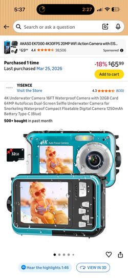 4K Underwater Camera 16FT Waterproof Camera with 32GB Card 64MP Autofocus Dual-Screen Selfie Underwater Camera for Snorkeling Waterproof Compact Float$25San Antonio, TX