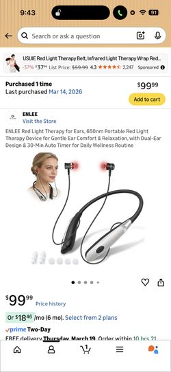 Red Light Therapy for Ears, 650nm Portable Red Light Therapy Device for Gentle Ear Comfort & Relaxation, with Dual-Ear Design & 30-Min Auto Timer for $25San Antonio, TX