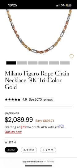14k Gold Classic Tricolor Milano Rope Figaro Chain Necklace for Men Women Boy Girl / Solid Durable Link Design for Him Her$1,999Indianapolis, IN