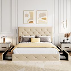 B394 $130 Upholstered Queen Size Platform Bed Frame with 4 Storage Drawers, Adjustable Headboard with Diamond Stitched Button Tufted Design, Wooden S$130Upland, CA