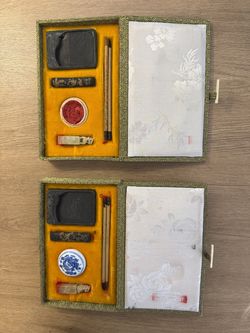Complete Chinese Calligraphy Set – Includes 2 traditional calligraphy brushes, ink stone, ink stick, red ink paste porcelain bowl, and stone seal for $10Katy, TX