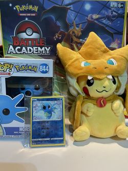 New Pokémon bundle- Battle Academy Board Game, Cosplay Pikachu Charizard Plush 8”, Horsea Funko #844 and 20 Pokemon Cards $50Huntington Park, CA