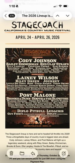 2 Stagecoach 2026 3 day coral reserved seats SEC H row J $$3,156Indio Hills, California